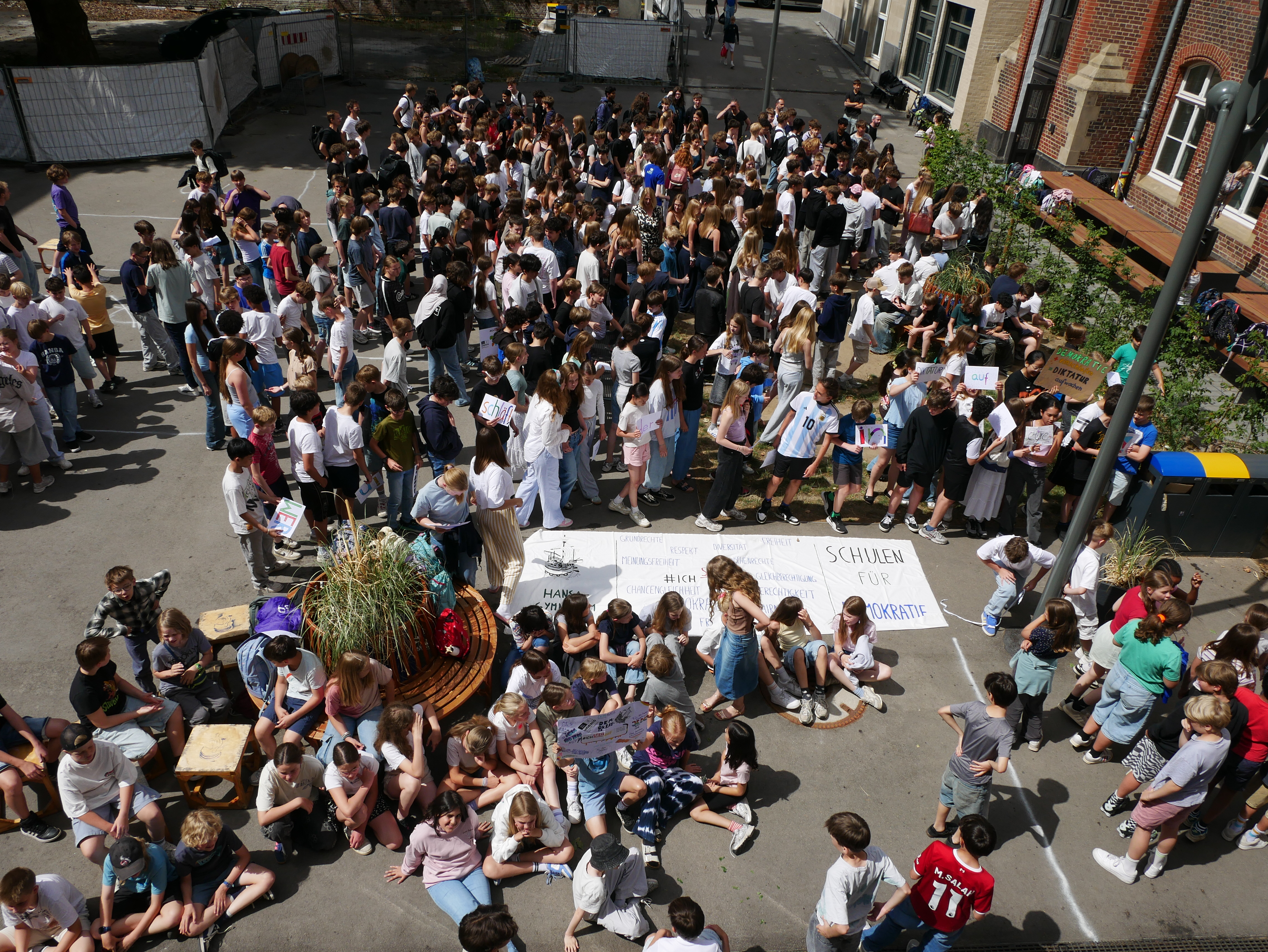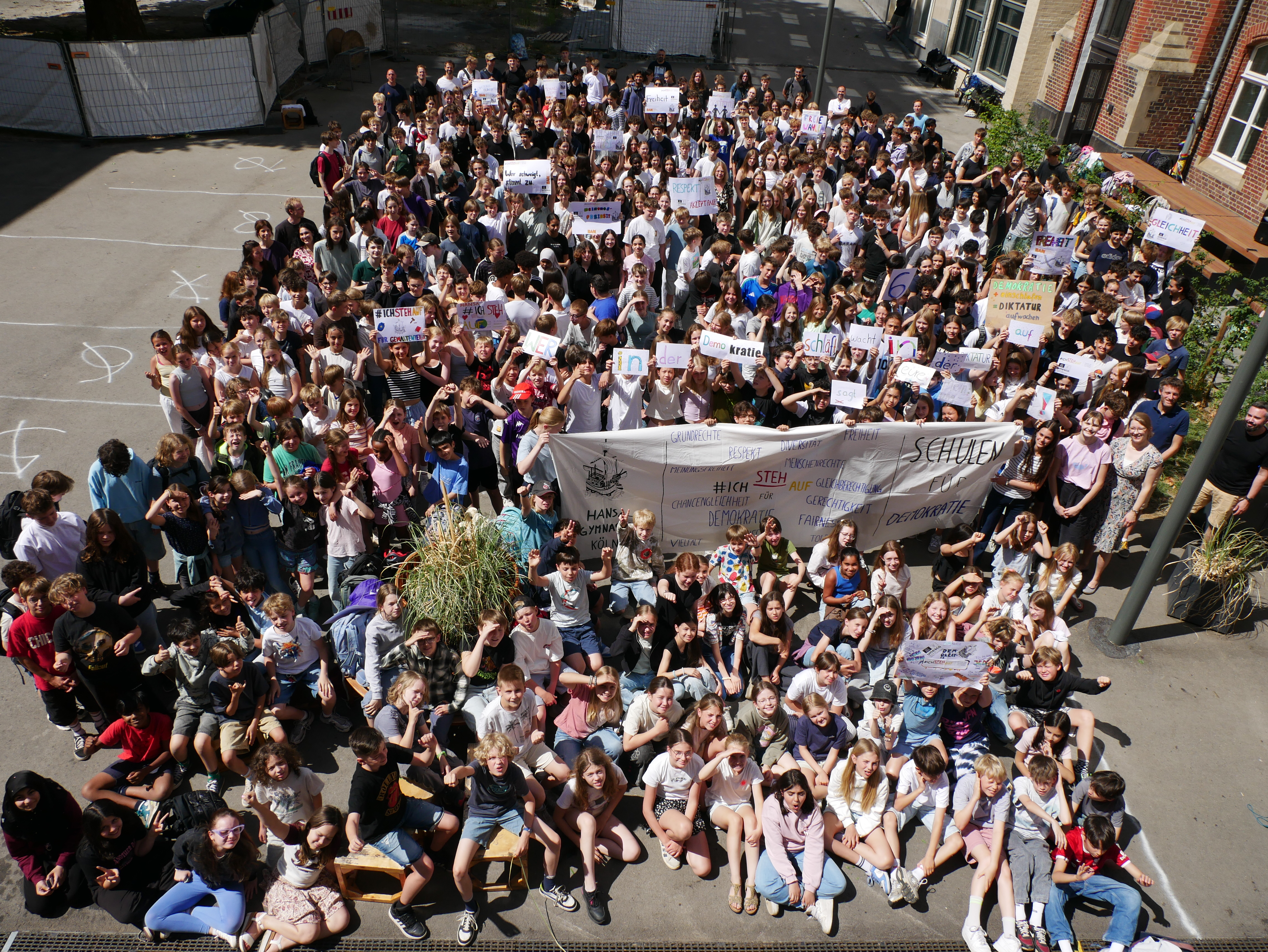 Am 3. Juli hat die SV am Hansa eine große Fotoaktion mit allen Schüler:innen und Lehrer:innen auf dem Schulhof ins Leben gerufen.