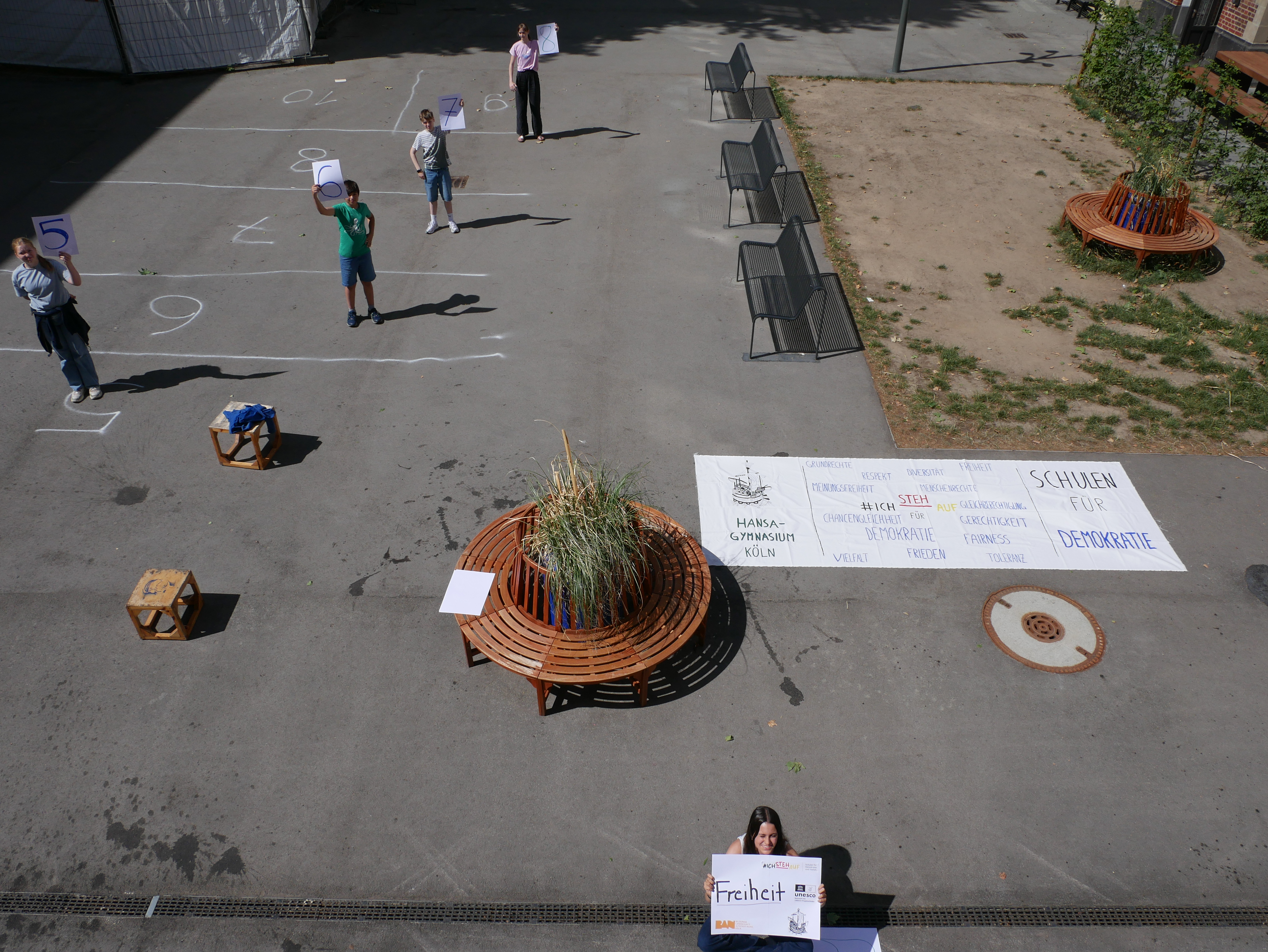 Im Unterricht in den Tagen vor der Aktion haben sich alle Klassen mit dem Thema „Demokratie“ beschäftigt und Plakate gestaltet, die besonders wichtige Aspekte der Demokratie zeigen. Am 3. Juli sind wir dann schließlich bei schönstem Wetter auf dem Schulhof zusammengekommen, um alle zusammen, mit Plakaten und bester Laune ein Foto zu machen und damit ein ein Zeichen zu setzen.